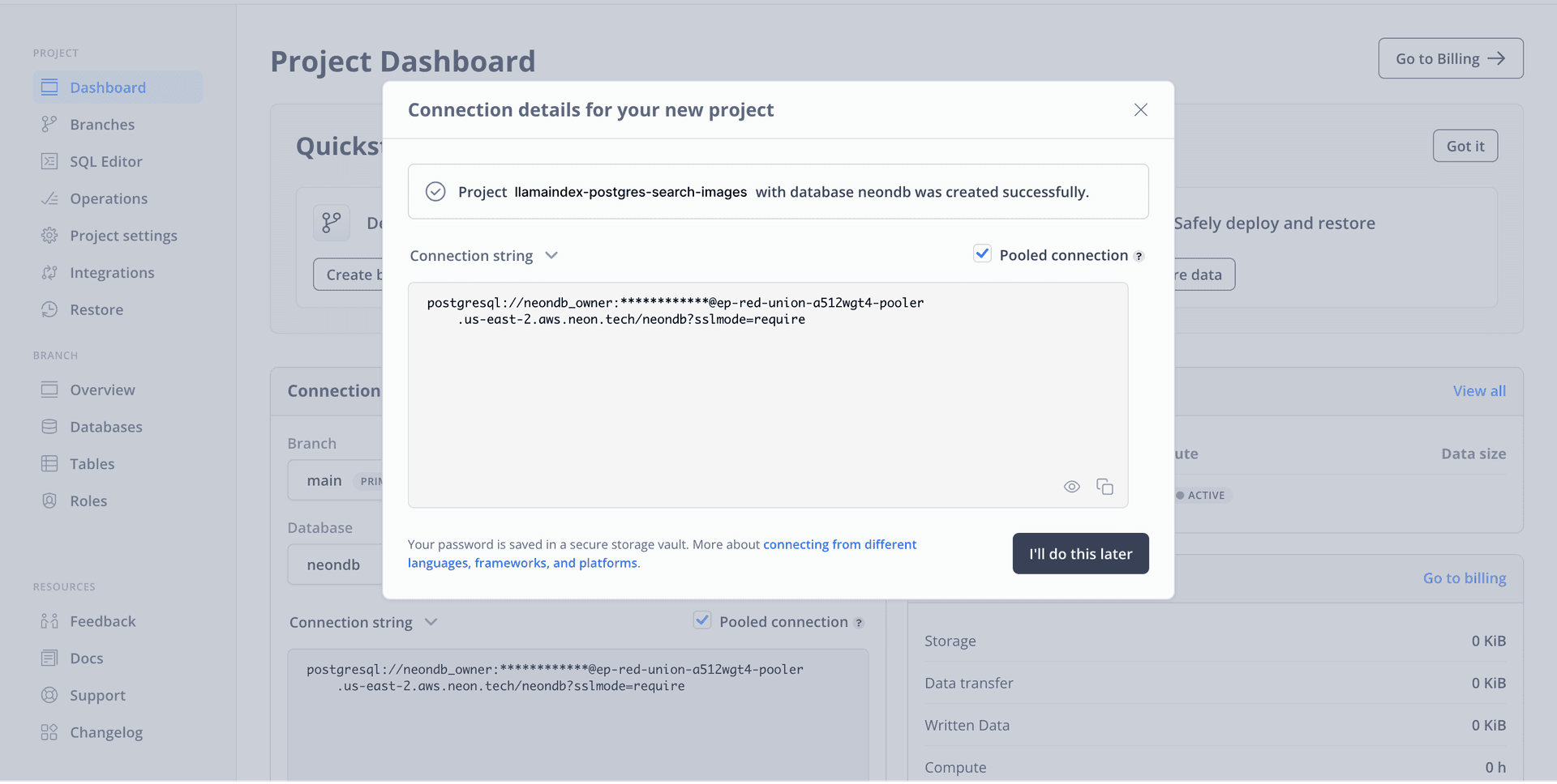 Save this connecting string somewhere safe to be used as the POSTGRES_URL further in the guide. Proceed further in this guide to create a Astro application.